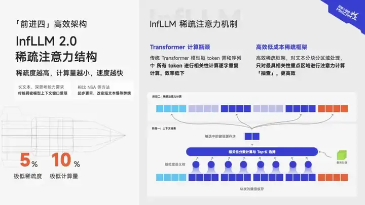 自 2024 年,我们已开启 InfLLM 为代表的稀疏注意力研究。同时相比思想上与 InfLLM 同源、年初 DeepSeek 发布的 NSA 方法,可以有效改善短文本速度较慢的弊端。 通过创新架构自动换挡,可针对不同任务切换注意力机制——