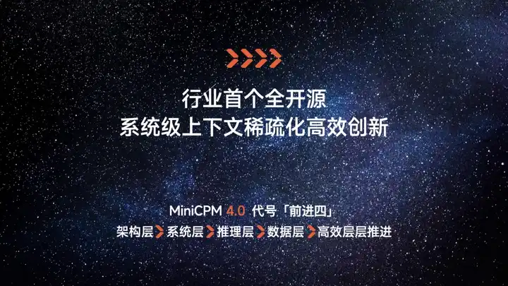 一次,是效能的狂想。创新大爆发,小钢炮 4.0 贡献了 行业首例全开源的系统级上下文稀疏化高效创新。5% 极高稀疏度,带来极限加速;更以目不暇接的自研创新技术,从架构层、系统层、推理层、数据层层层优化,真正做到 系统级软硬件稀疏化高效落地。