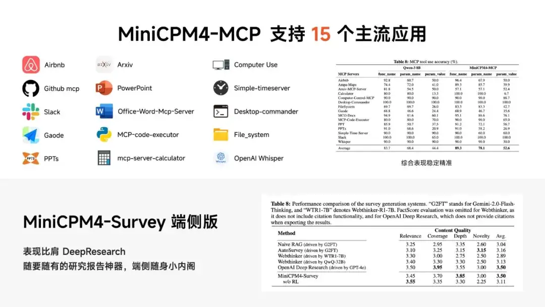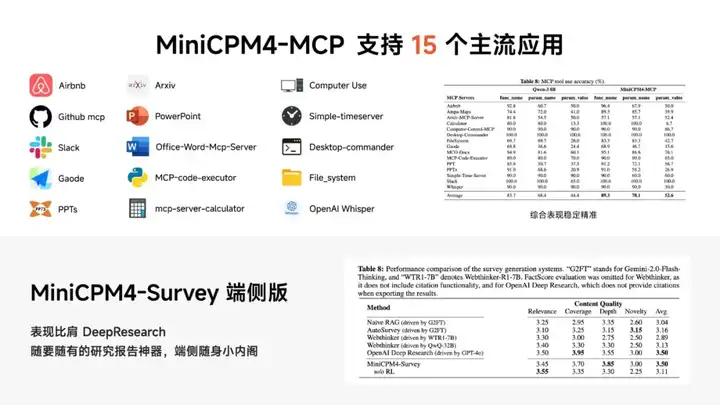 同时加强了对 MCP 的支持,且性能超过同尺寸开源模型(Qwen-3-8B),进一步拓展了模型开发、应用潜力。在应用上实现了端侧比肩 DeepResearch 的表现,可成为用户的端侧「小内阁」,随时随地生成高质量研究报告。
